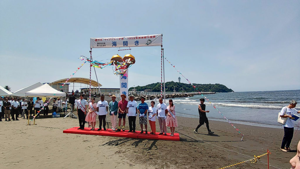 マイアミビーチショー実行委員会主催の2025「海開き」です。江島神社の神職の方々によって神事が執り行われ、実行委員長・鈴木藤沢市長はじめ、参列された全員で安全祈願をいたしました。