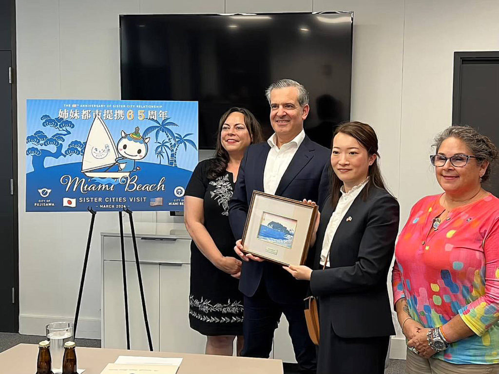 左は藤沢市のコミュニティーFM放送:レディオ湘南アナウンサー宮川さんから、マイアミビーチ市スティーブン・マイナー市長からのメッセージ紹介です。