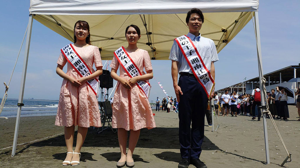 本年度の海の女王と海の王子です。左から、杉本理胡(すぎもと りこ)さん、吉田渚央(よしだ なお)さん、鈴木陽斗(すずき はると)君。一年間、藤沢市をPRするべく、観光事業等において活躍いたします。